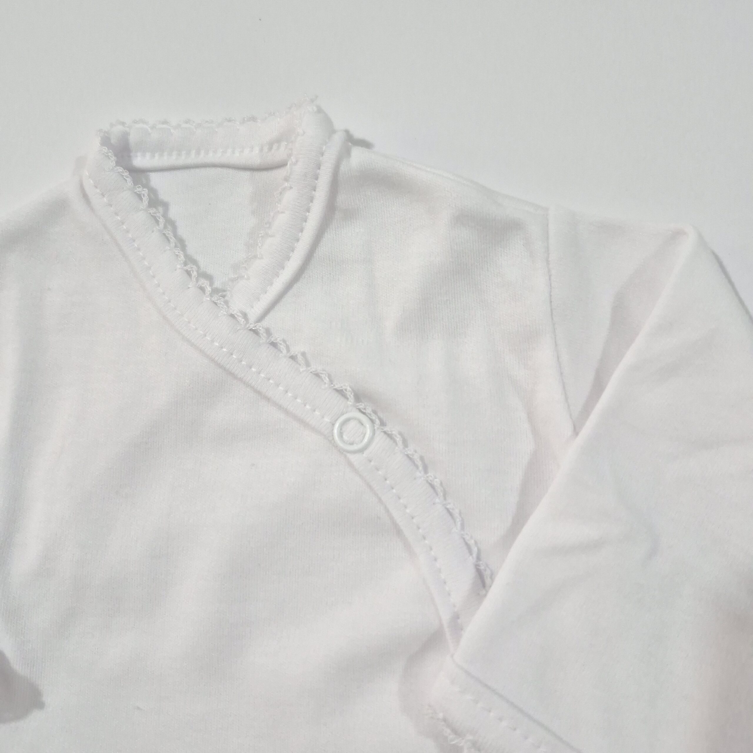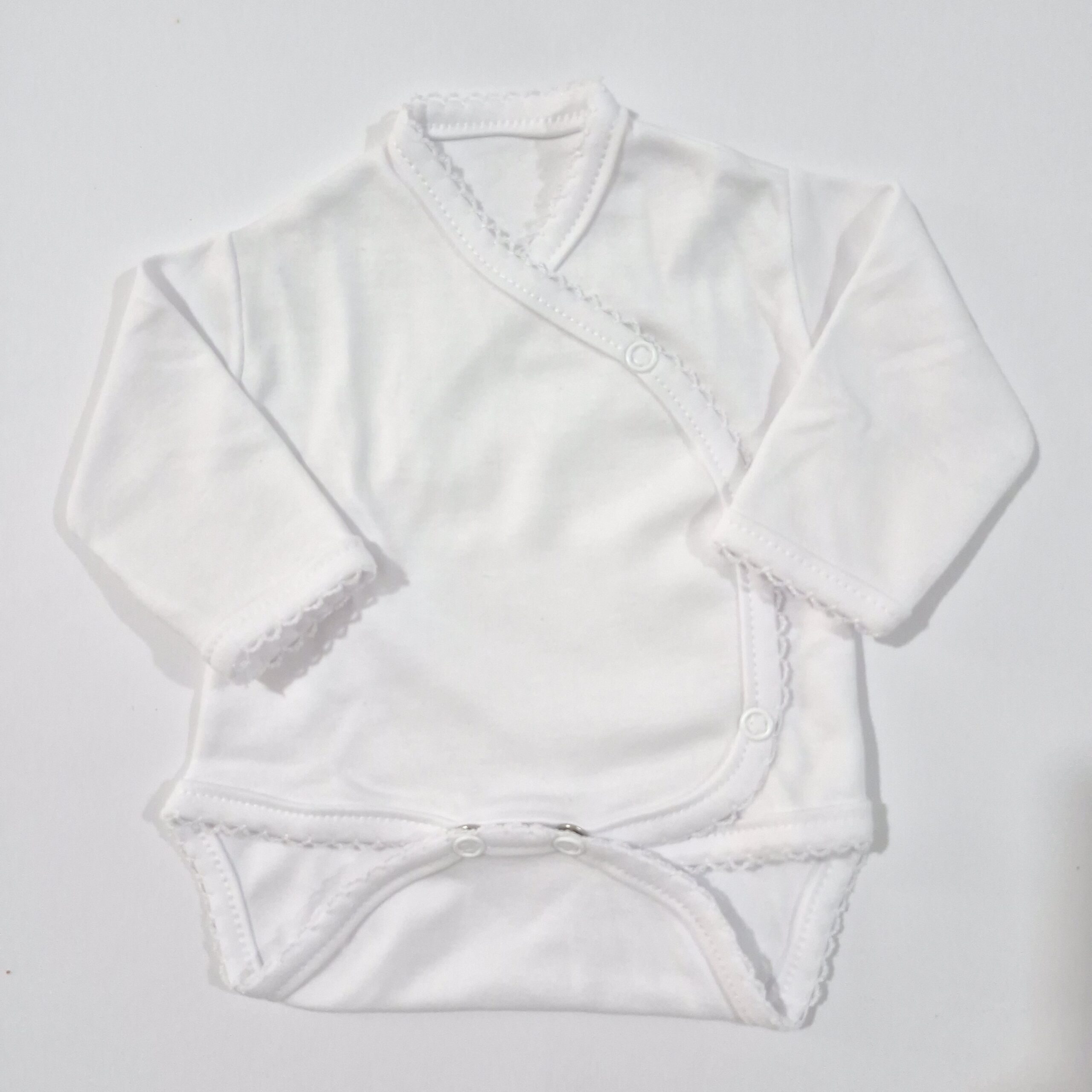 Body talle Prematuro con cierre cruzado, color blanco, confeccionado en 100% algodón pima.