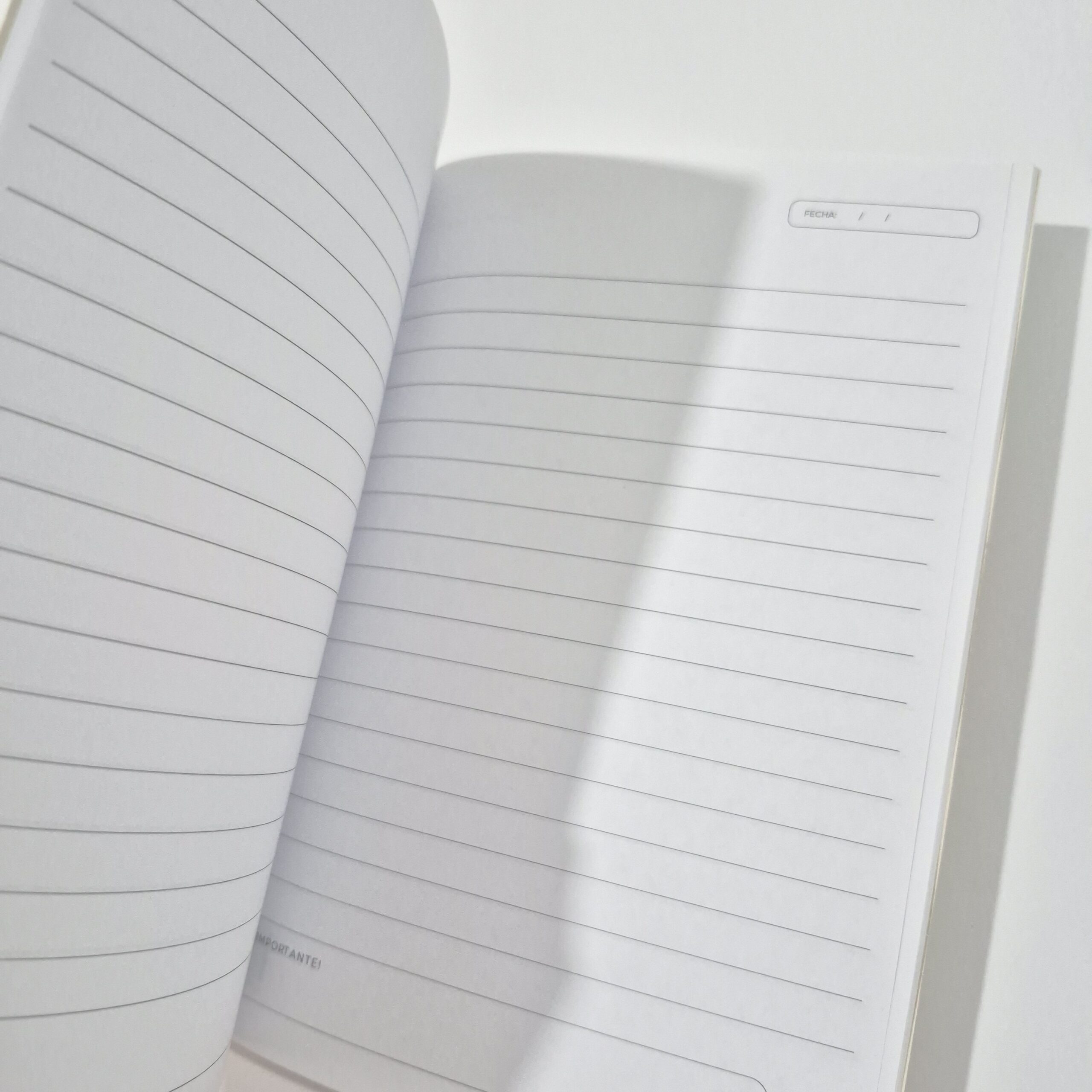 Cuaderno tapa blanda, con hojas rayadas y espacio para colocar la fecha.