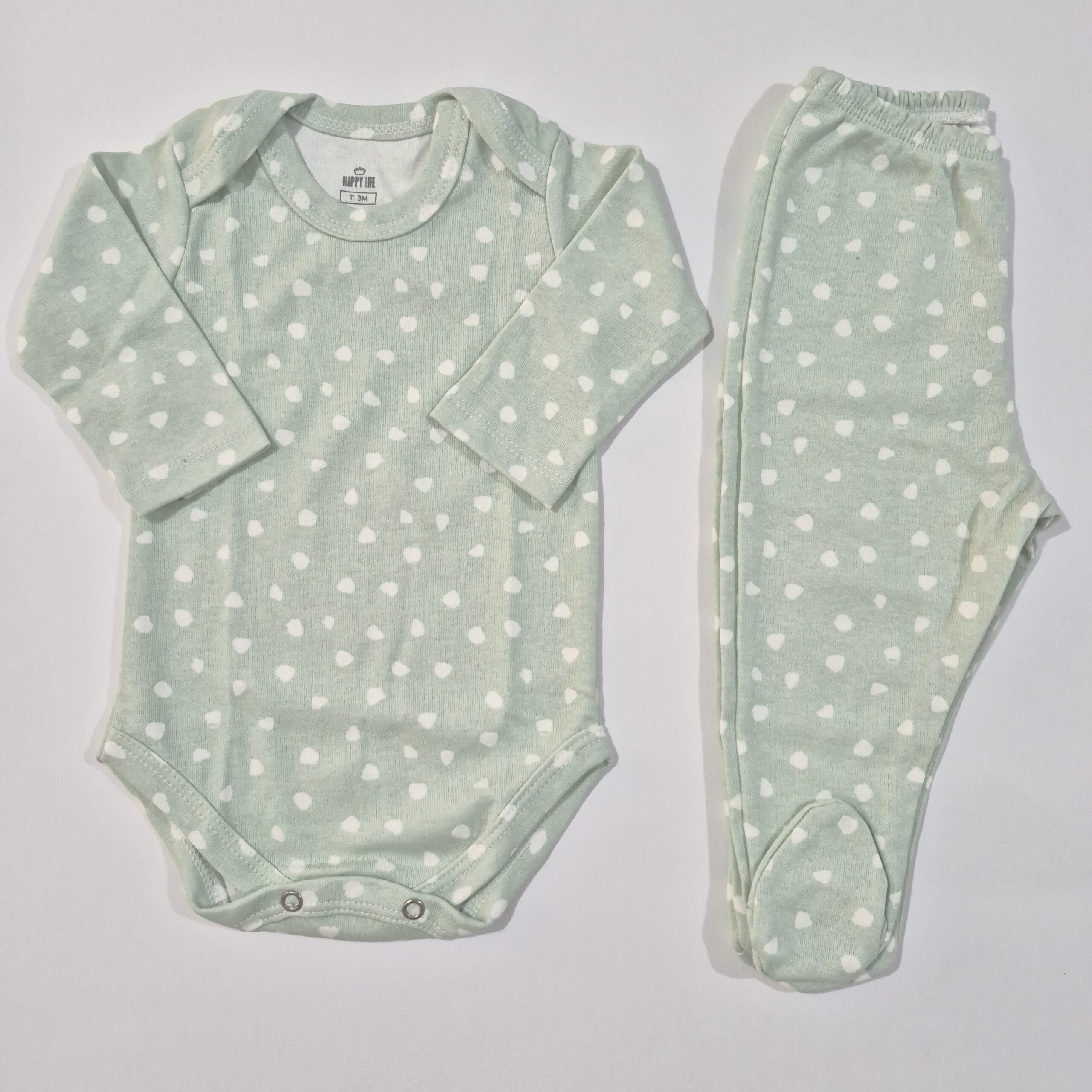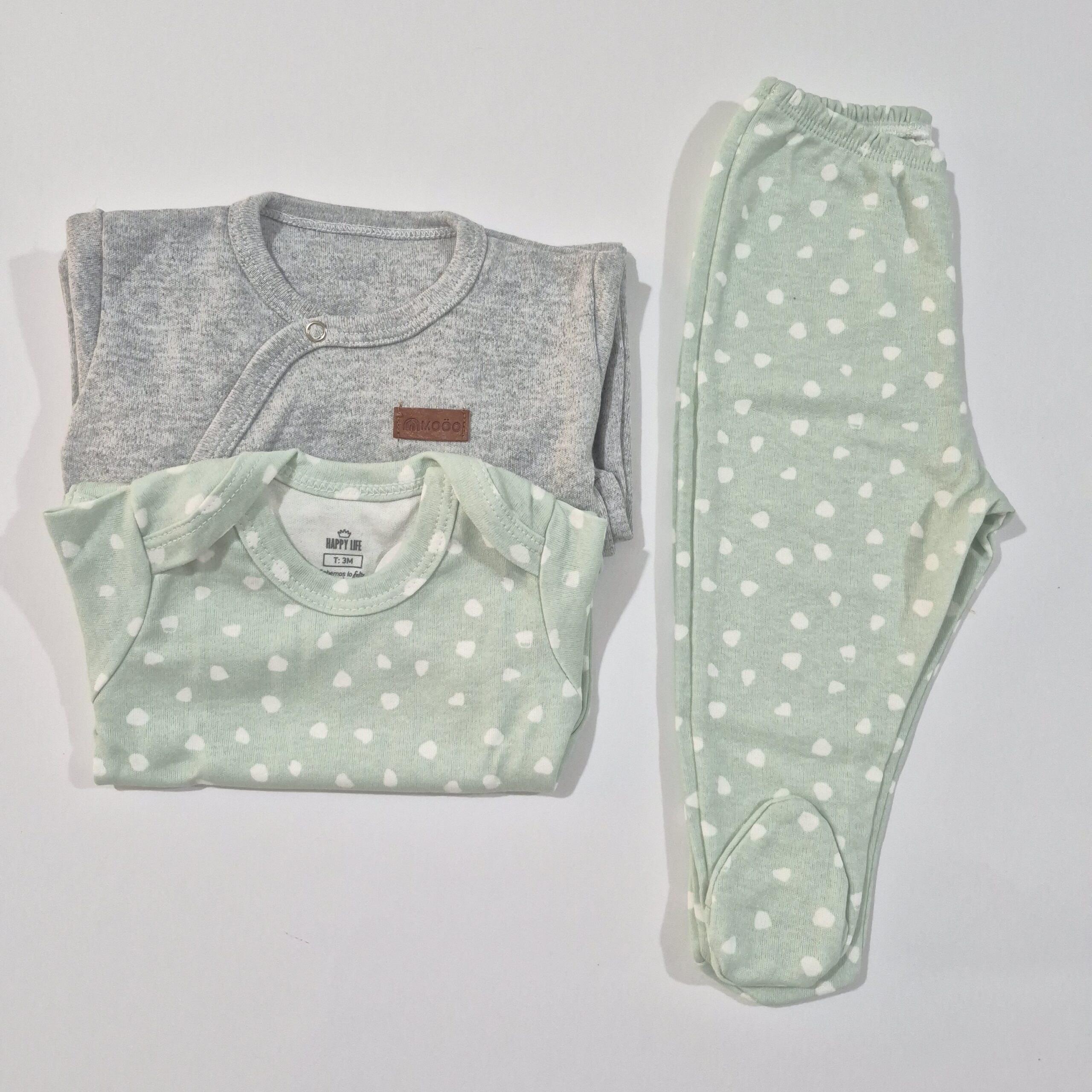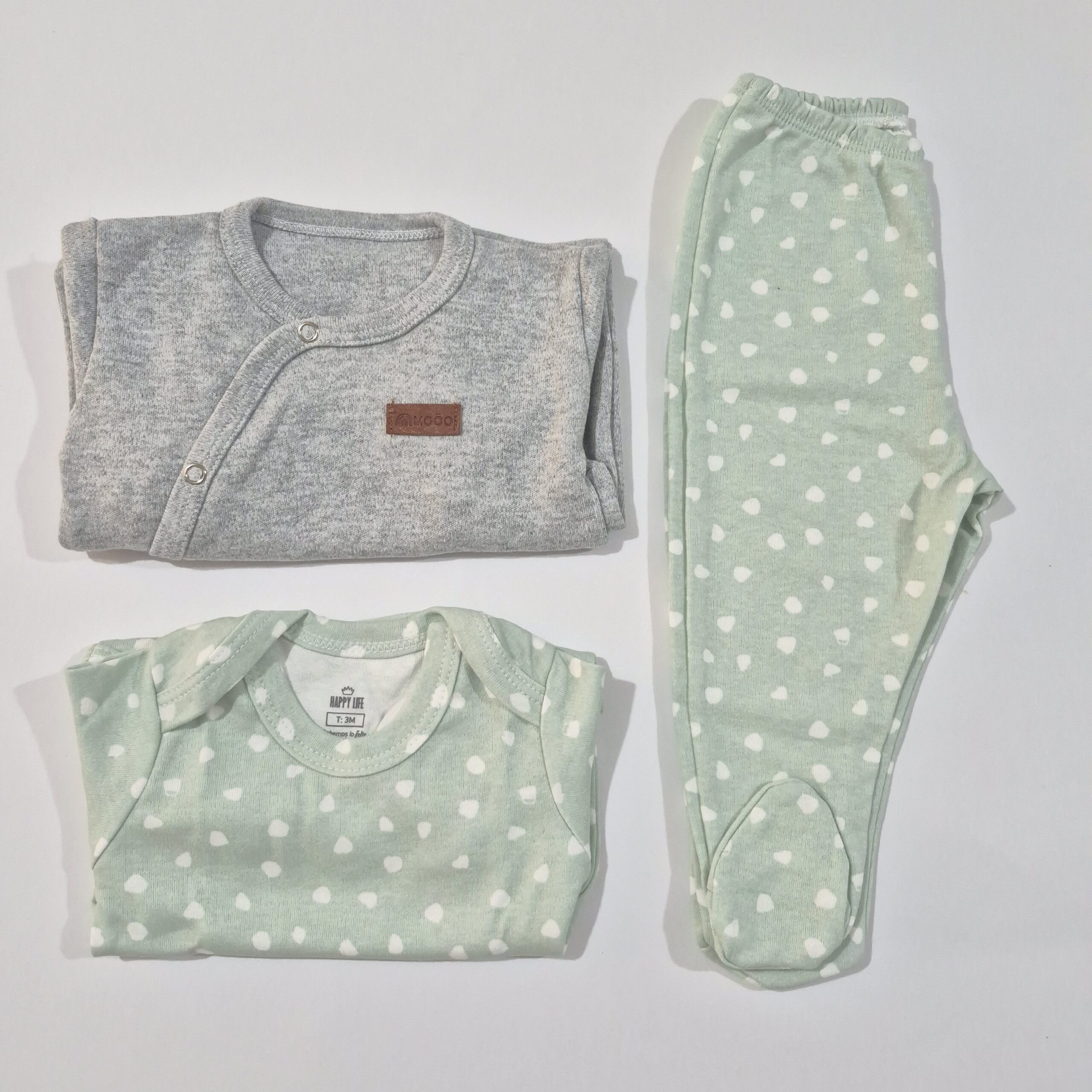 Incluye un body con cuello americano que facilita el cambio, una ranita, ambos en un delicado tono verde pastel con estampa de manchitas blancas que aporta frescura y dulzura al conjunto, y un enterito color gris de algodón con cierre de broches en la parte delantera lo que facilita el cambio del bebé y la limpieza del cordón umbilical.