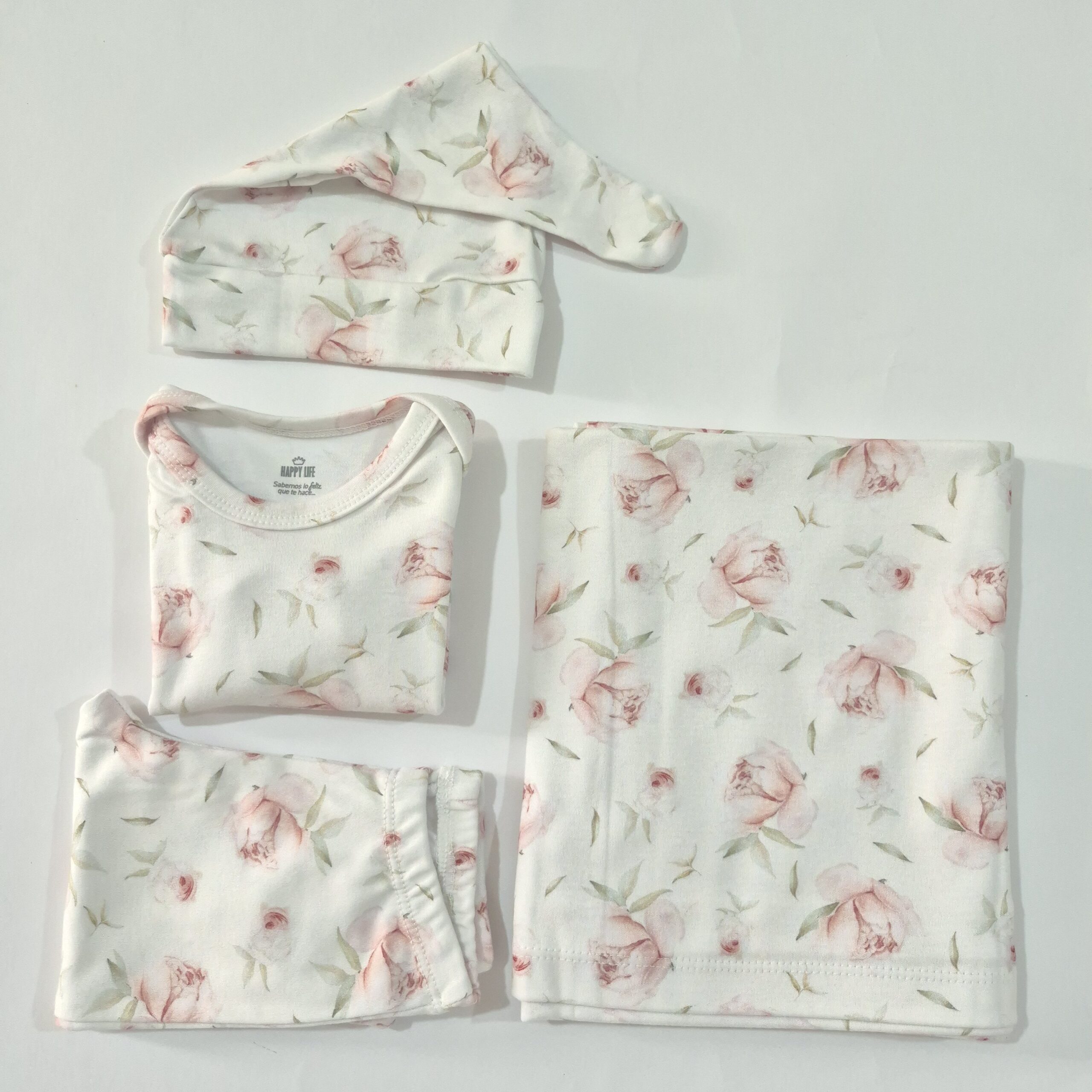 Un conjunto pensado para envolver a tu bebé en suavidad, calidez y ternura desde el primer día. Este kit talle 0 a 3 meses combina diseño romántico y calidad premium, con un delicado estampado de flores en tonos suaves que transmite calma y armonía.