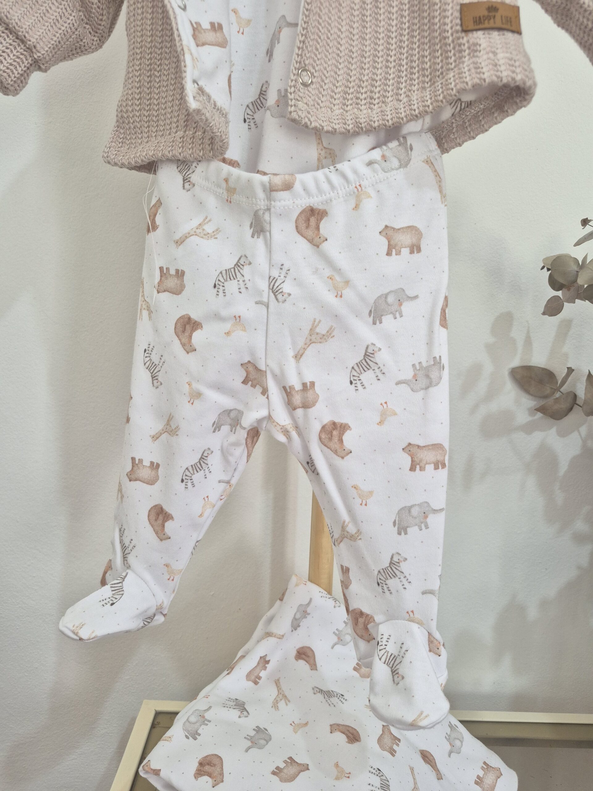 Manta de algodón pima, liviana y abrigada, perfecta para envolver al bebé, usar en la cuna o llevar en paseos.Cardigan tejido color beige, de diseño clásico y atemporal, con interior forrado en algodón pima con el mismo estampado de animales tiernos, logrando una armonía delicada en todo el conjunto. Su cierre delantero con broches de metal facilita el cambio y aporta practicidad sin perder estilo.